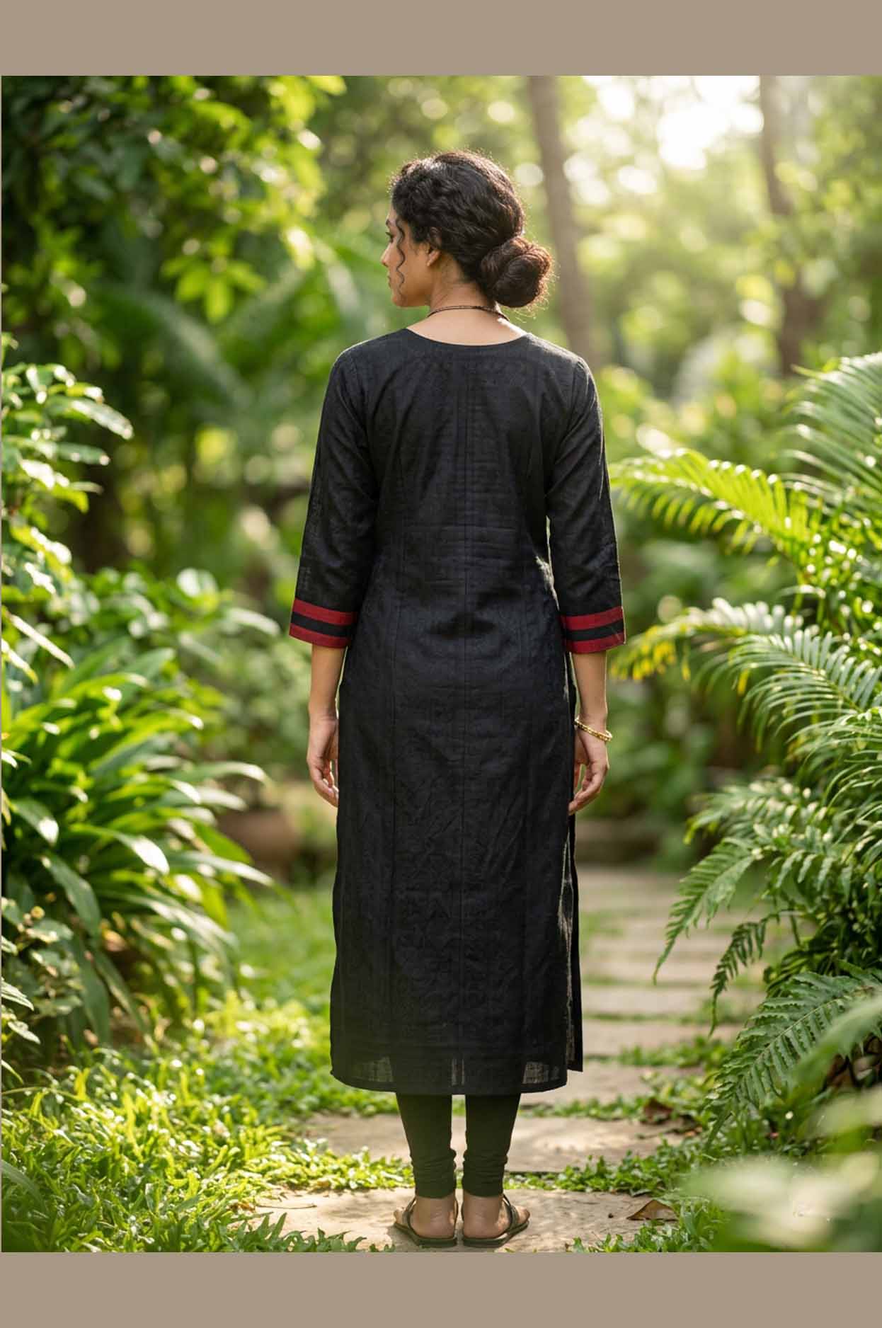 The rich black base is beautifully enhanced with intricate Sambalpuri patterns in subtle earthy tones, creating a timeless and sophisticated appeal. Made from soft, breathable cotton, it ensures comfort while maintaining a graceful silhouette.