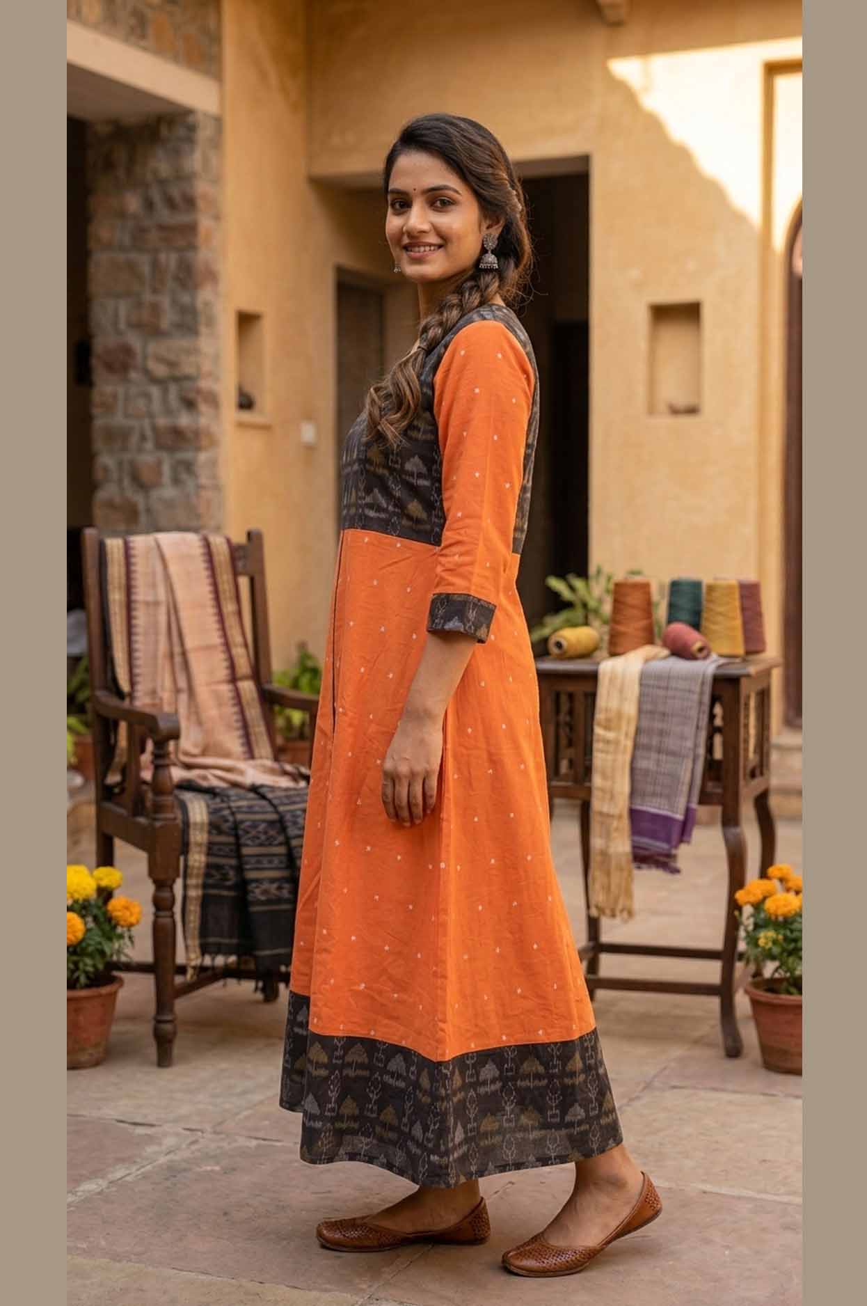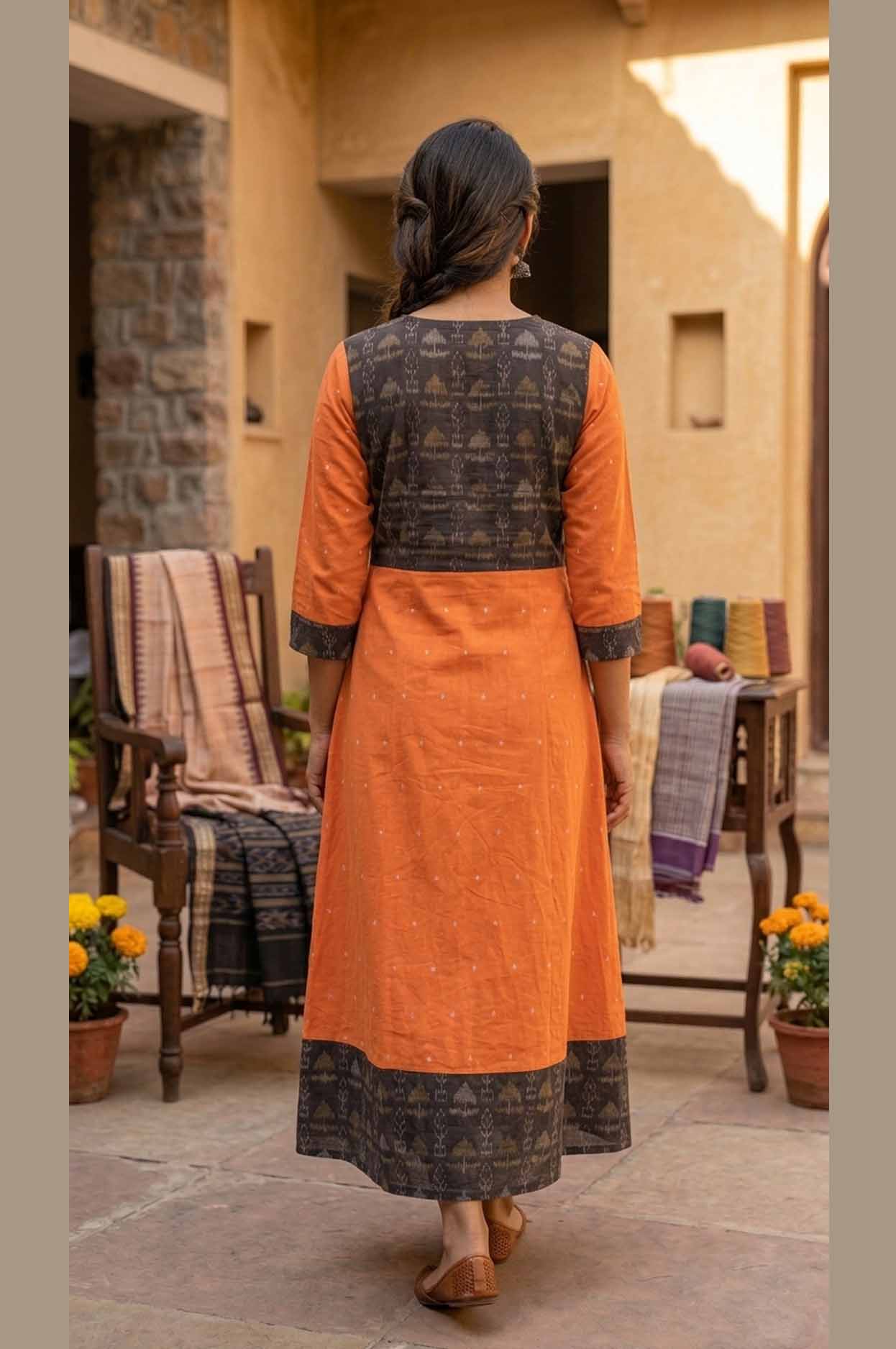 Sambalpuri Handloom Cotton AnarkaliKurti – Orange & Black Traditional Design