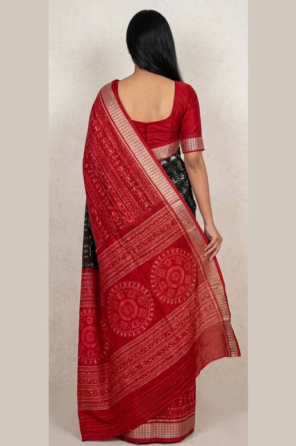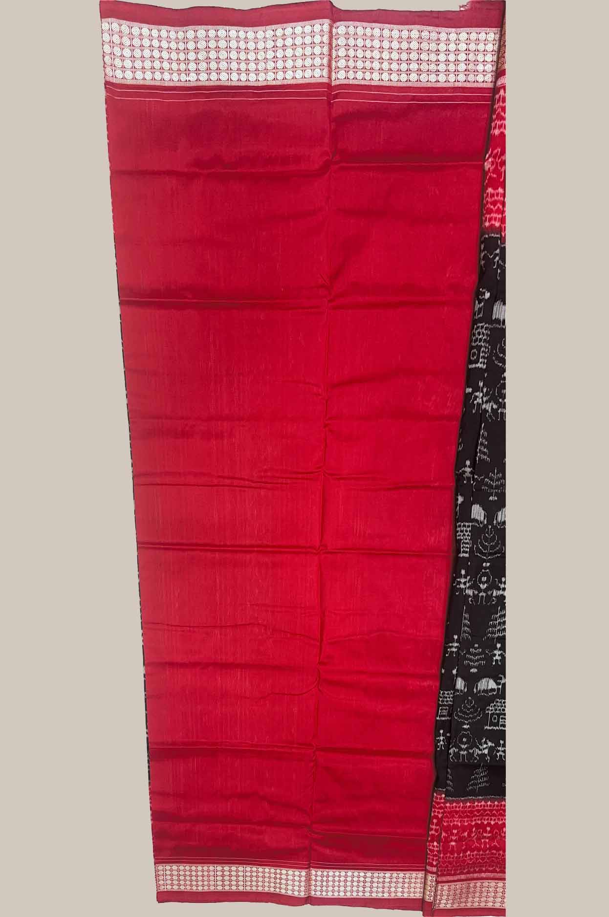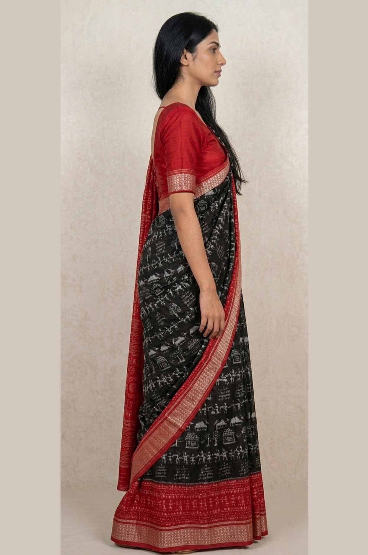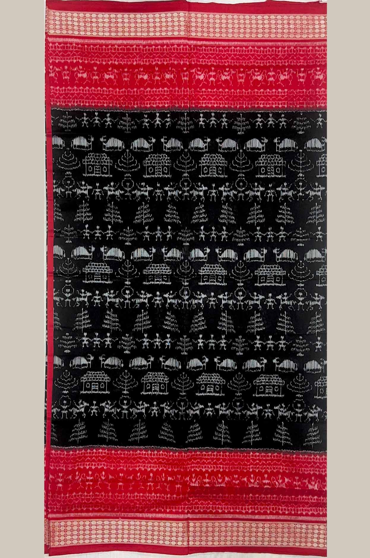 - Design & Artistry: The saree features a striking black body adorned with traditional Ikkat motifs, including tribal figures, huts, and nature-inspired patterns. This storytelling through threads represents the rustic beauty of rural Odisha.