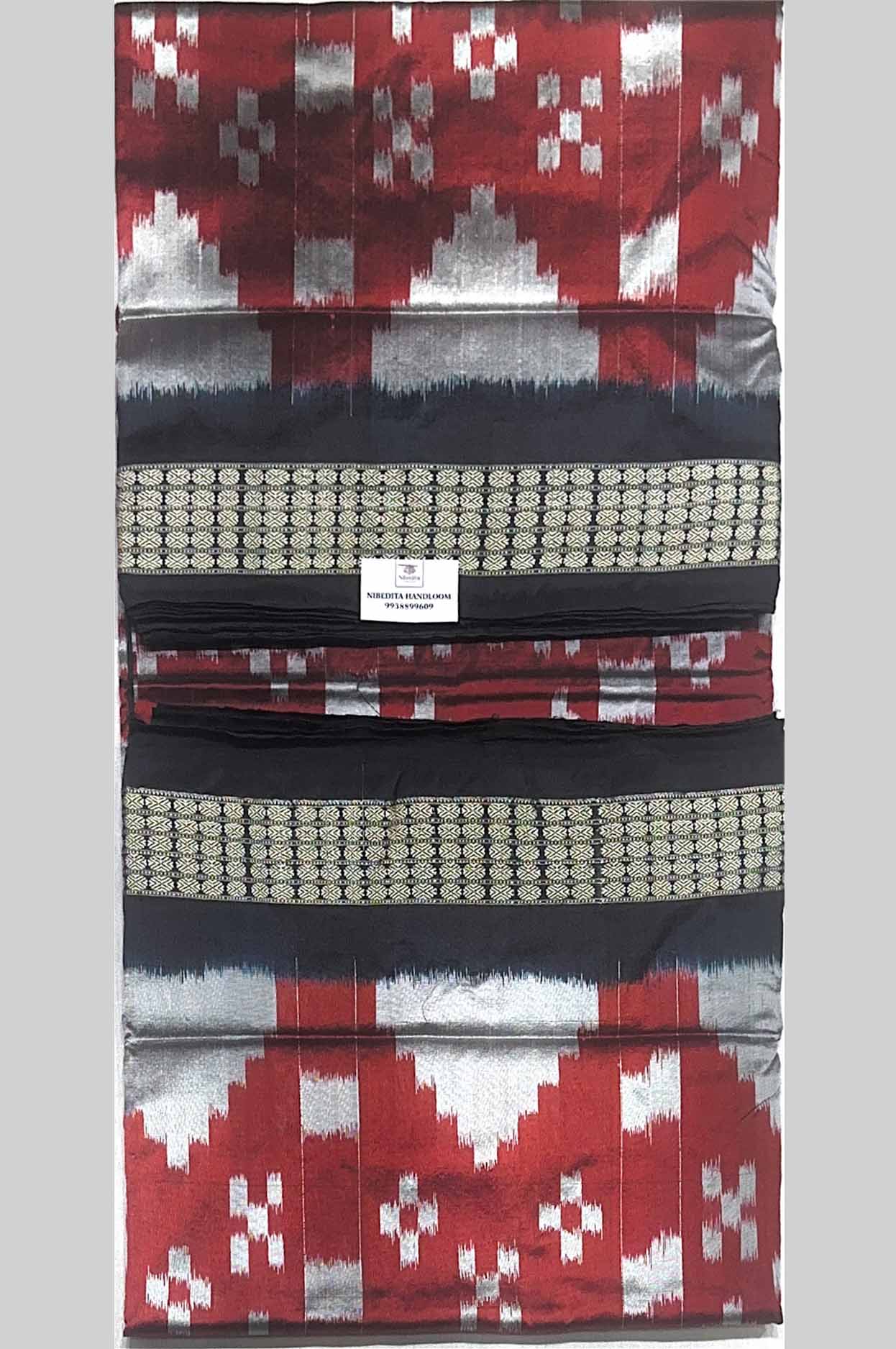 This saree features a bold, deep red body adorned with traditional white ikat (Bandha) motifs, creating a striking and graceful pattern. The design is beautifully enhanced with subtle grey accents and finely woven borders, adding a refined and sophisticated finish to the overall look.