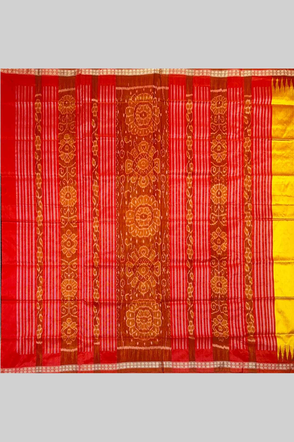 The highlight of this saree is its bold red temple border and pallu, designed with classic triangular patterns that reflect traditional Sambalpuri artistry. The striking yellow and red combination creates a vibrant and festive appeal.