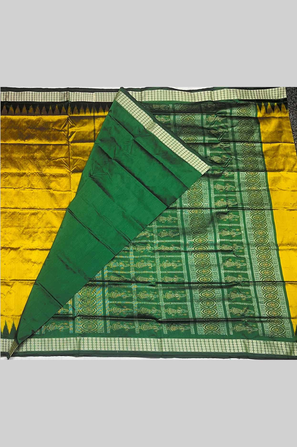It is beautifully finished with a deep green contrast temple border and pallu, highlighted by classic triangular temple patterns and intricate woven detailing. The mustard and green combination creates a bold yet traditional appearance, perfect for festive occasions.