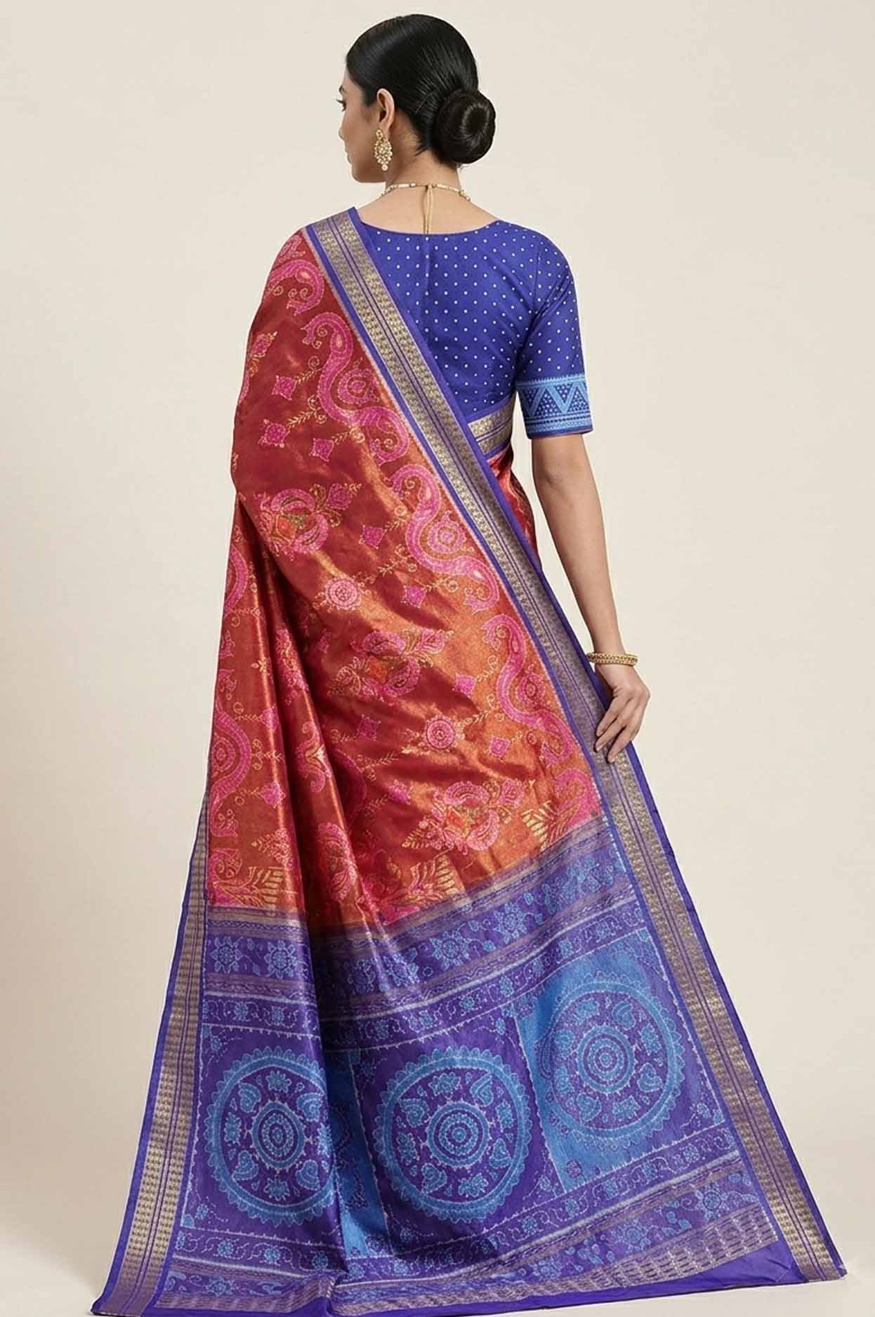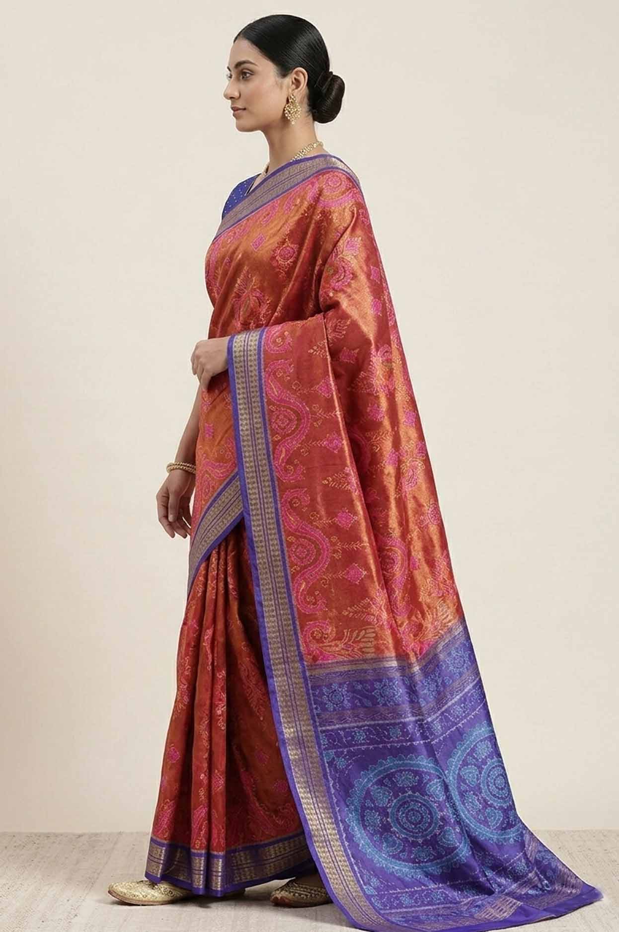 ✔️ Intricate Ikat (Bandha) Art: Traditional motifs jo pallu aur borders par bariki se ukeri gayi hain.