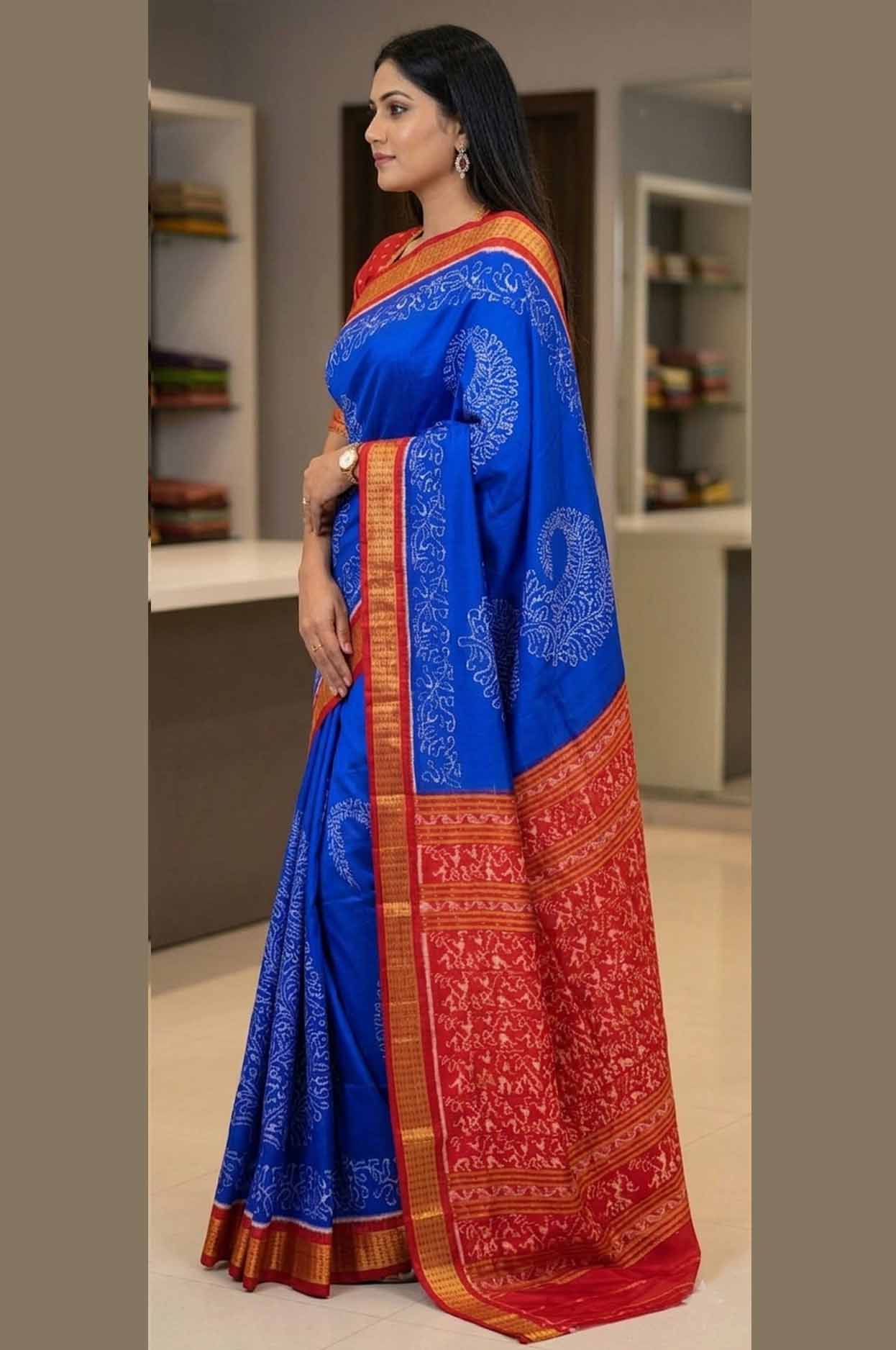 - Color Palette: A vibrant Royal Blue body contrasted beautifully with a rich Crimson Red border and pallu.