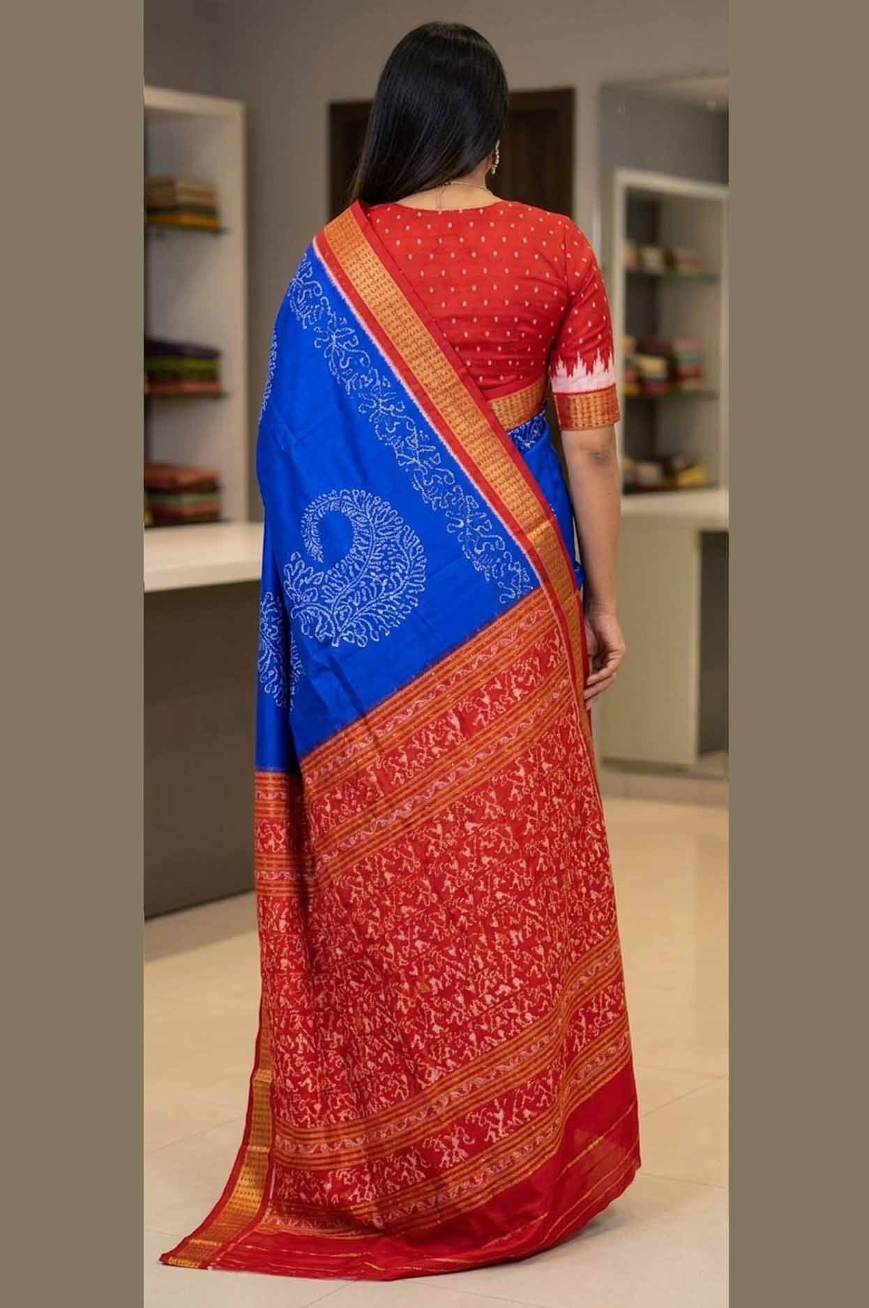 - Blouse: Complemented by a matching Red Ikkat-style printed blouse with a Zari border to complete the regal look.