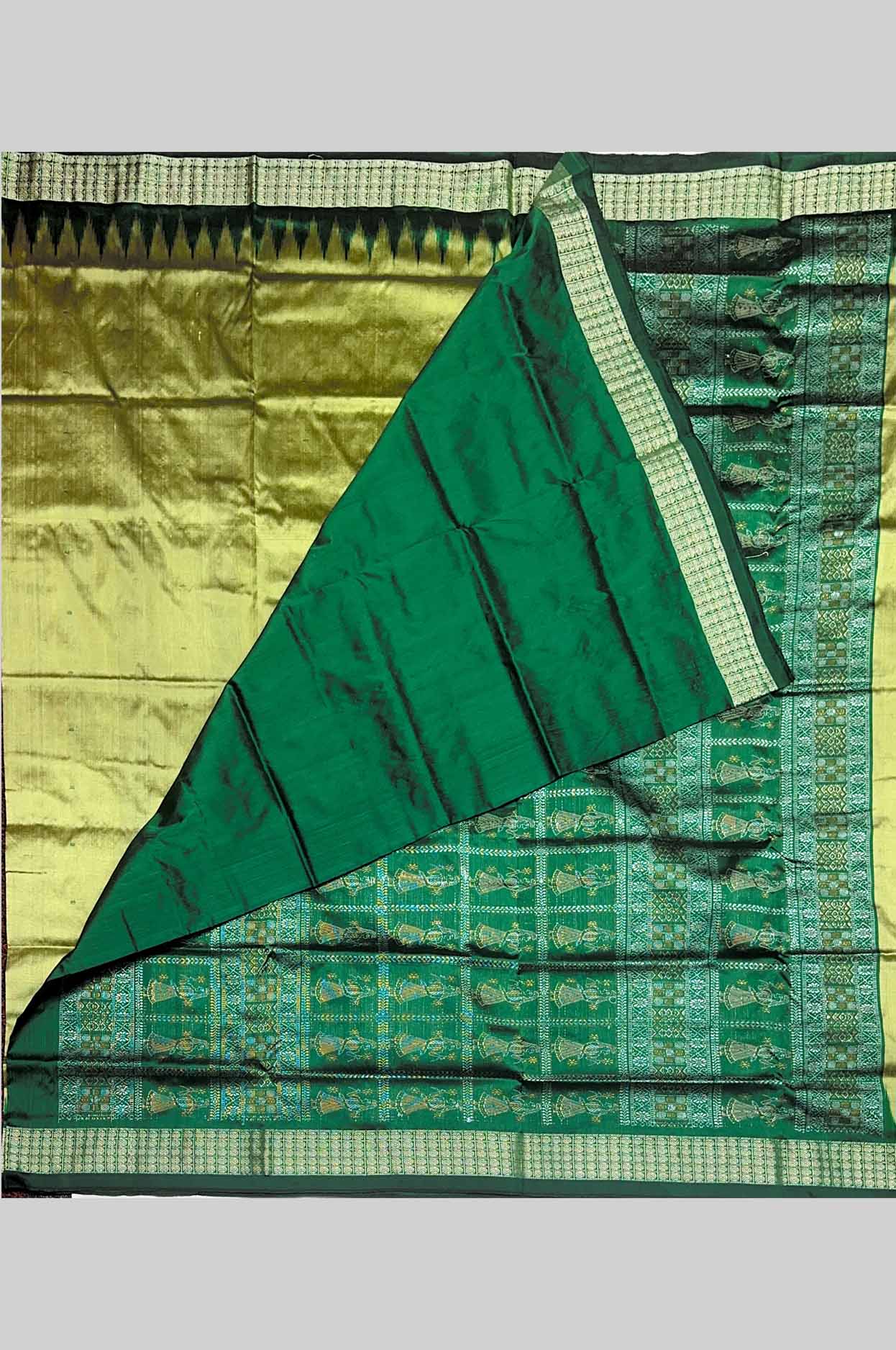 It is beautifully paired with a deep green contrast temple border and pallu, highlighted with traditional triangular patterns that bring out its authentic Sambalpuri identity. The combination of yellow and green creates a fresh, soothing, and festive look.